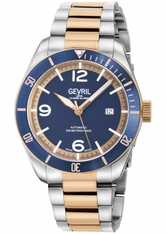 Gevril Swiss Made Sellita SW200, Blue Bezel. Blue Dial, Two toned Rose Gold Bracelet