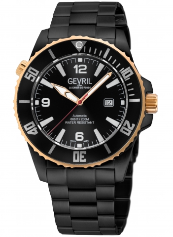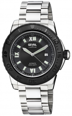 Gevril Stainless Steel Black Dial Luminous Hands Swiss Made Automatic Bracelet Date Watch