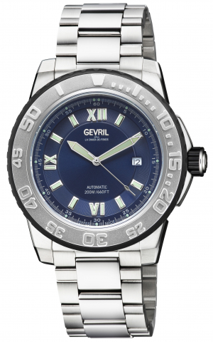 Gevril Stainless Steel Blue Dial Luminous Hands Swiss Made Automatic Bracelet Watch